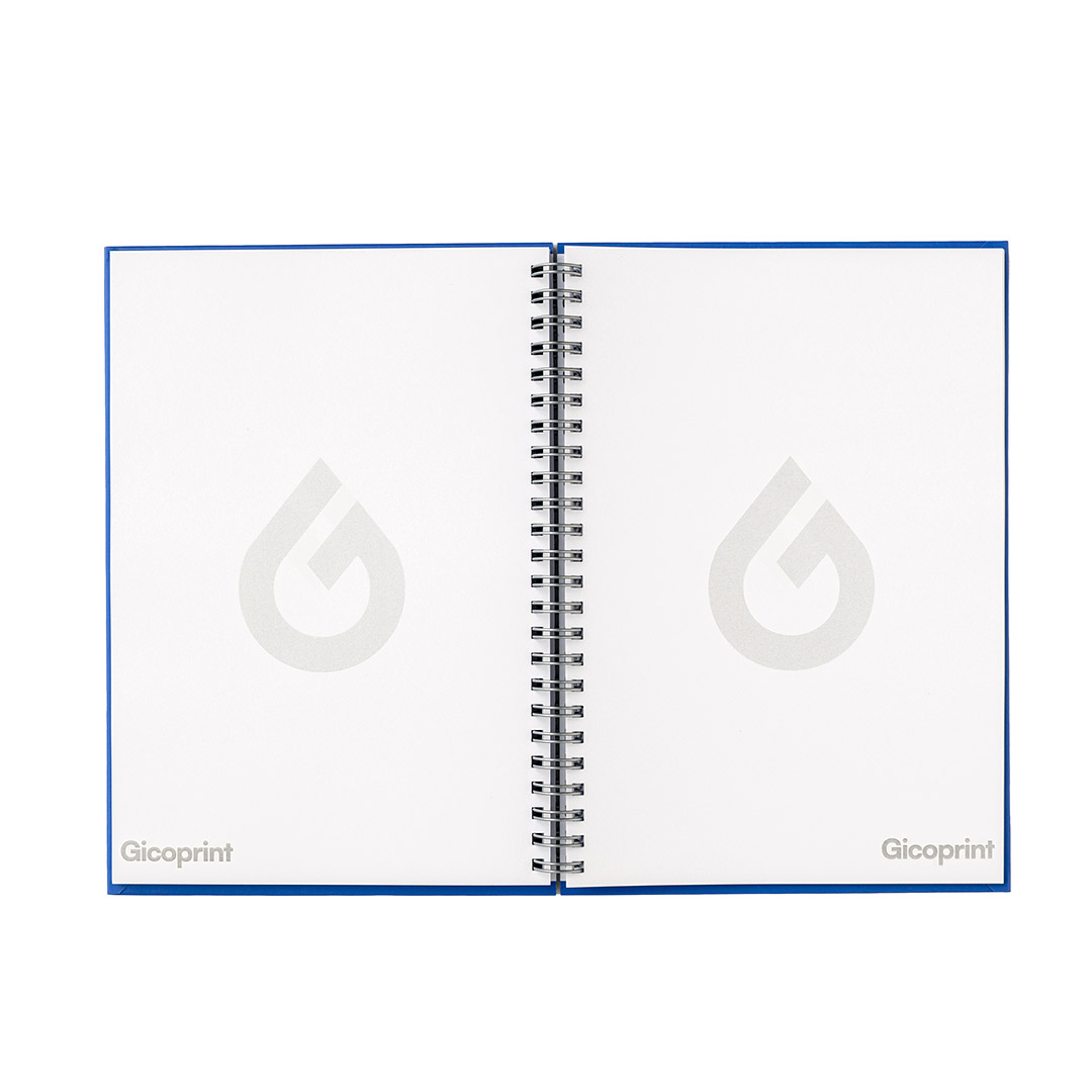 Libretas tapa dura tamaño A5 (148 X 210 mm), 100% personalizables con los colores corporativos de la empresa. Libretas formadas entre 100 y 300 páginas, impresión de la portada a todo color y el interior en negro a una o dos caras o a todo color a una o dos caras. Encuadernación en espiral plástico o wire-o.